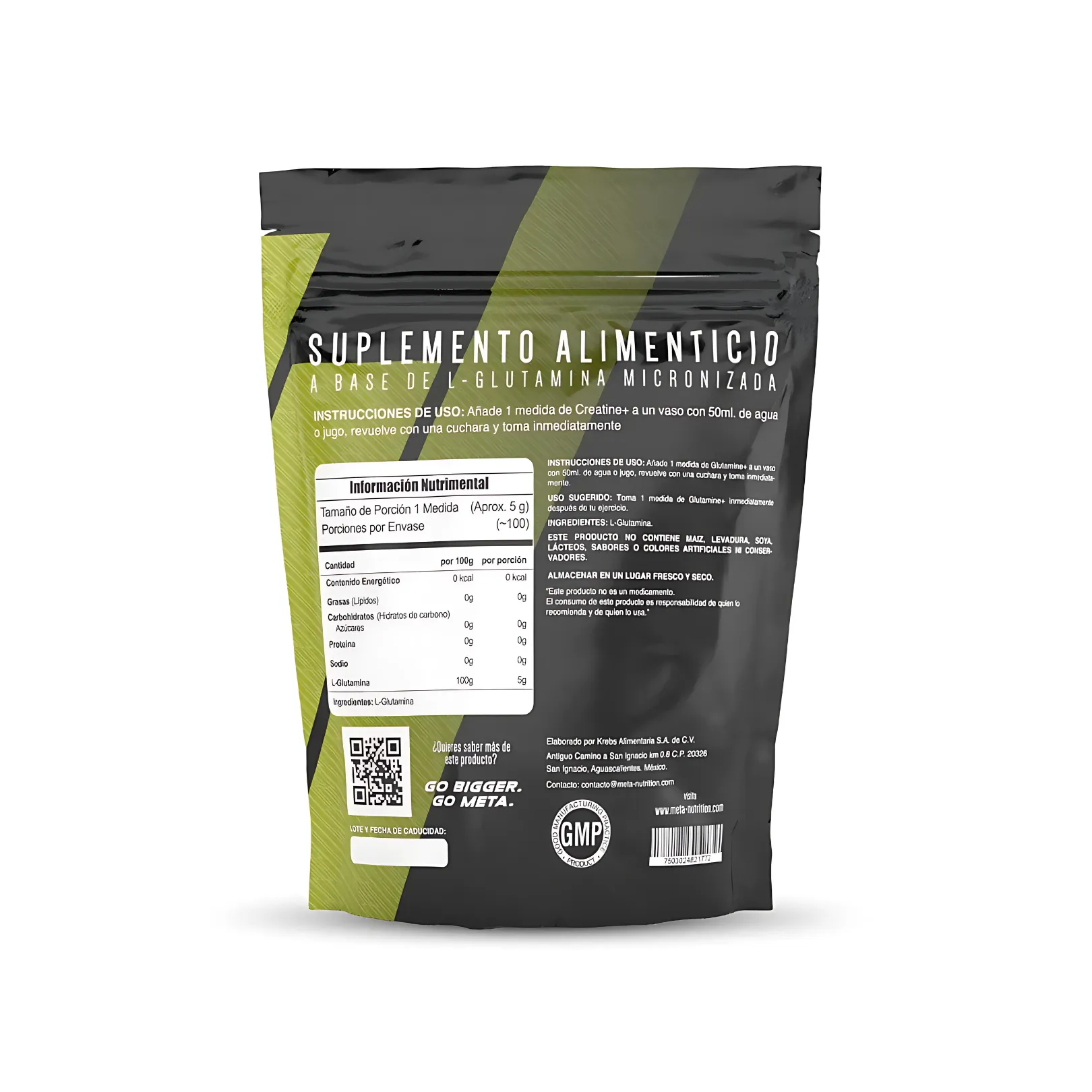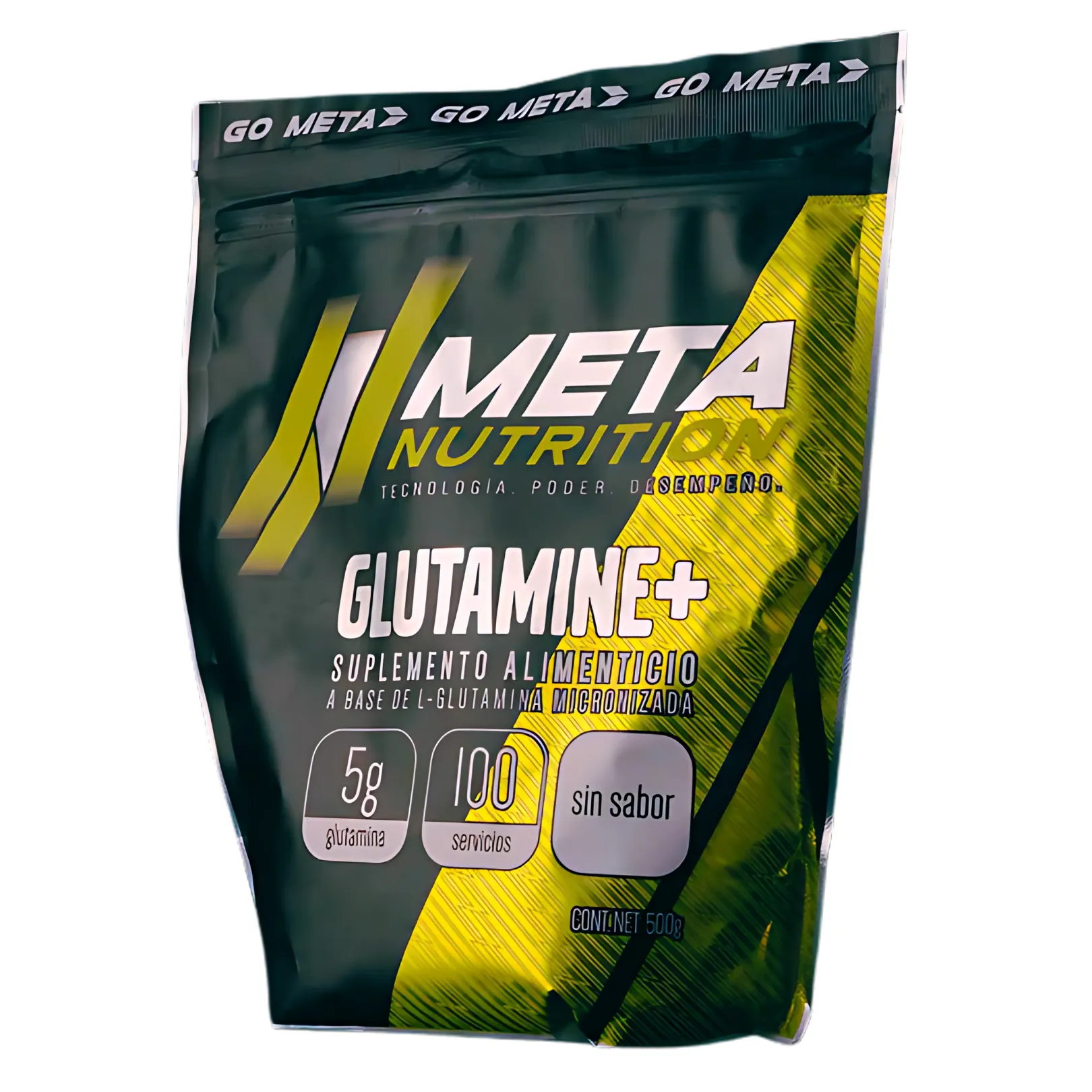 Glutamine+ Meta Nutrition contiene 100 servicios de 5g cada uno. ¡¡Ahora con su poderosa  y mas ecológica nueva presentación en bolsa resellable!