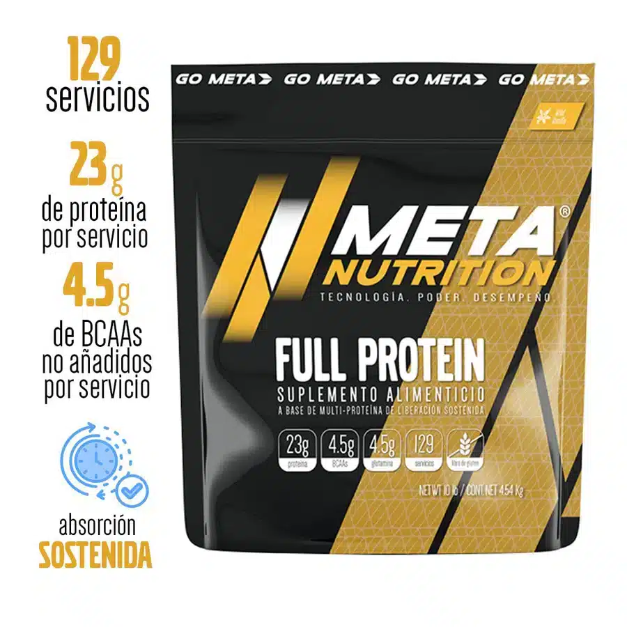 Proteína Full Protein de Meta Nutrition en presentación de 10 Lb es un suplemento de liberación sostenida formulado con un complejo multi-fase de proteina de la leche. Combina concentrado de suero, aislado de proteina de suero de leche, proteina hidrolizada y caseína micelar para ofrecer 23 g de proteína por porción. Esta fusión de proteina isolate e isolate protein optimiza la absorción de aminoácidos en fases rápida, media y lenta. Con su perfil de BCAA y glutamina, Full Protein minimiza el catabolismo y potencia la recuperación, siendo ideal como proteina para mujeres, deportistas y quienes buscan proteina para bajar de peso.